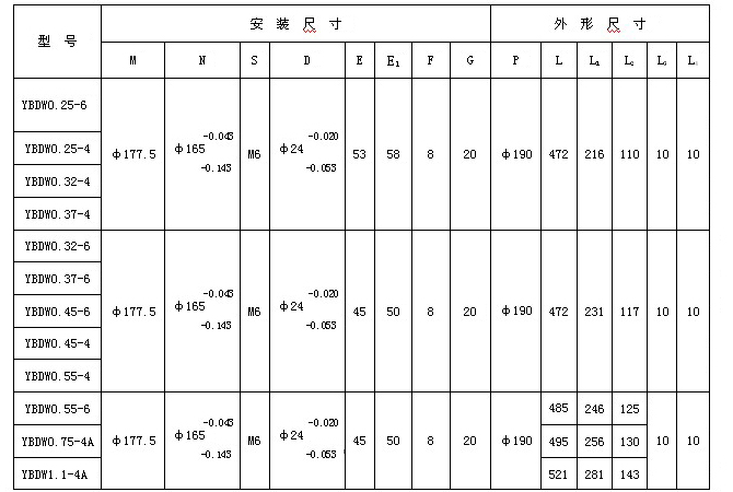 YDW系列隔爆型电动机外形尺寸及安装尺寸(0.25kW~1.1kW)